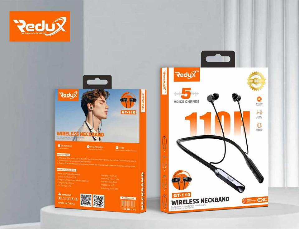 Upgrade your audio experience with the ReduX GT-110 Wireless Neckband, designed for powerful performance, long battery life, and everyday comfort. Perfect for music lovers, gamers, and professionals who need reliable wireless sound all day long.